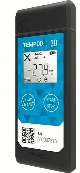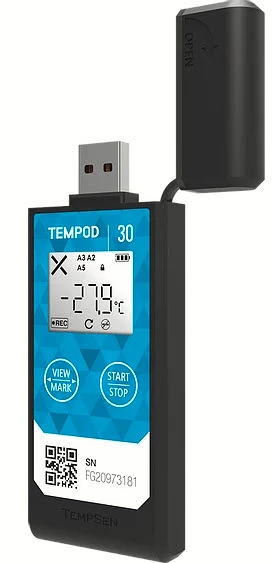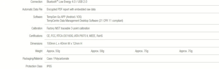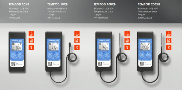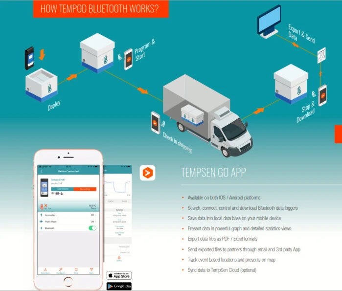 Tempod 20B bluetoothTEMPOD® BLUETOOTH® DATA LOGGERSBluetooth® AccessAccess, control and download data logger outside of package or vehicle through Bluetooth® Low Energy (BLE) connection.Auto PDF Report With Embedded Raw DataAutomatically generated encrypted PDF format report, no software required to access data file. PDF report includes recording summaries, statistics, alarm information, graph and optional tabular data. Embedded raw data allows further data processing via TempSen Cloud and 3rd party system.Built-in USB ConnectorEnables quick connection with PC anytime anywhere, no cable and reader required to download data.Flight ModeLogger keeps recording with Bluetooth® wireless turned off under Flight Mode, and user could awake logger up from xflight mode remotely using TempSen Go App on smart device.Password ProtectionEnable password protection to prevent unauthorized manipulation to device.MOQ : 10 unitsOTHER MODELS AVAILABLE