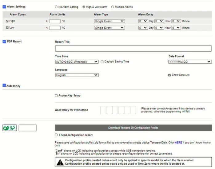 AUTO PDF REPORT WITH EMBEDDED RAW DATAAutomatically generated encrypted PDF format report, no software required to access data file.PDF report includes recording summaries, statistics, alarm information, graph and optional tabular data.Embedded raw data allows further data processing via TempSen Cloud and 3rd party system.SOFTWARE-FREE ONLINE CONFIGURATIONPowered by TempSen patented SFP (Software Free Programming) technology, it's super simple to configure a data logger anywhere, anytime and on any platform, no need to install any software, just connect logger to computer and apply the configuration file downloaded, configuration will be done in one second.POWERFUL LCD INDICATIONLCD presents following key information of recording task.