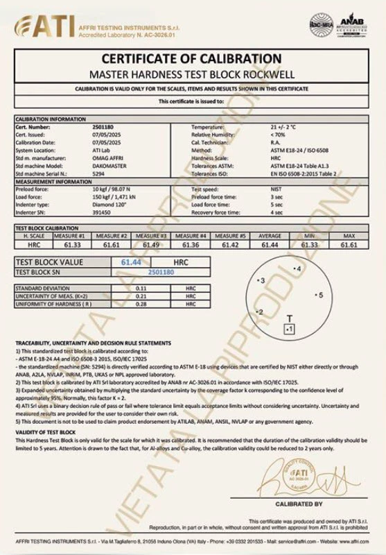 ATI provides certified hardness test blocks for calibrating Rockwell, Brinell, Vickers, and Knoop hardness testers, ensuring full compliance with ASTM and ISO standards.