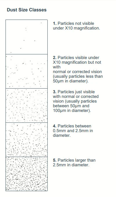 The Dust Test Comparator Chart shows 5 classifications of dust particles and 4 sections of contrasting backgrounds where the Dust Test Tape can be applied.