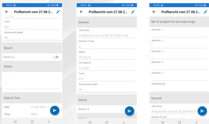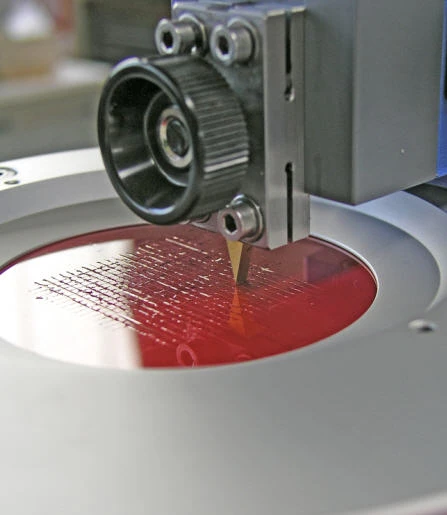 After carrying out the first cross hatch cut the instrument can be stopped and the test force (up to 50 N) can be adjusted individually before starting the next test track.