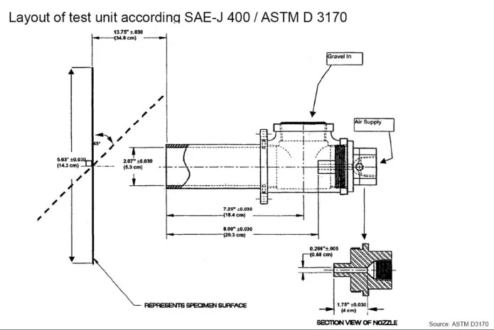 – The base of the SAE test method has been described in the standard “Test for Chip Resistance on Surface Coating” SAE J-400.
