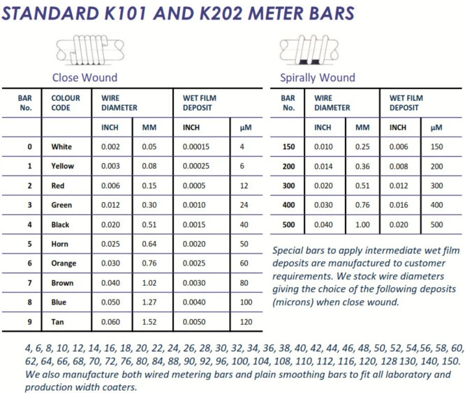 Close wound bars produce a coating thickness from 4 to 120μm. Higher coating weights up to 500μm can be obtained using spirally wound bars.