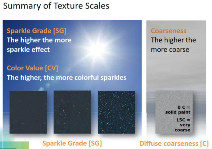 - The ability to set and digitally communicate global tolerances and measurement procedures for color, sparkle, and coarseness across the supply chain improves ongoing conformance