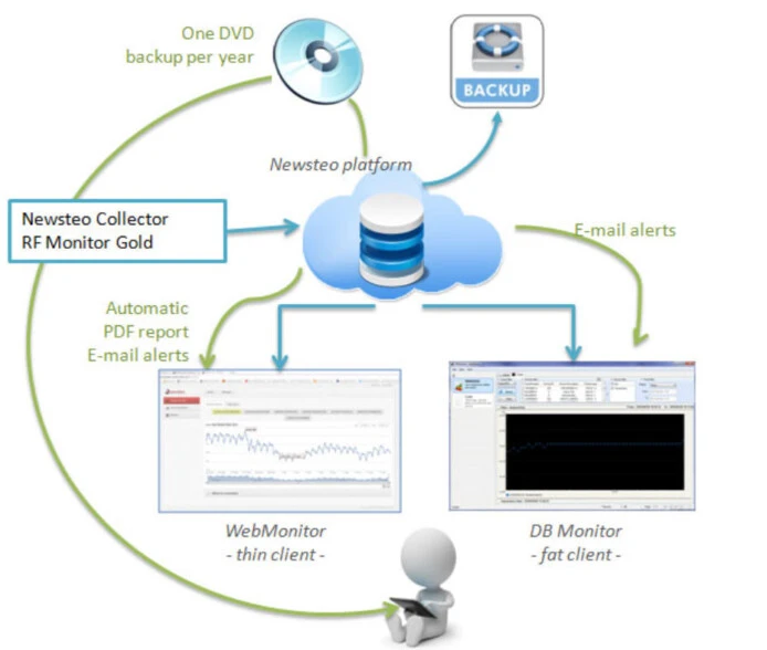 - RF Monitor Gold: for multi-site installations. Several Loggers networks are created. Each system communicates to a PC that transmits the measurement to a central database. From anywhere in the world, it is possible to connect to the database to check the measurements. This consultation is possible with free software DB Monitor.