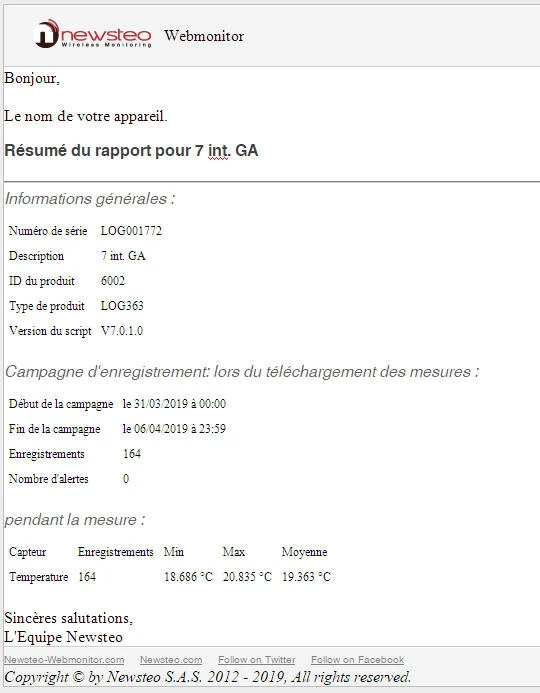Sending of a PDF report each week, including all measures and alerts detected by the logger - Using the DB Monitor software: immediate alerts by email when a threshold is exceeded in a logger