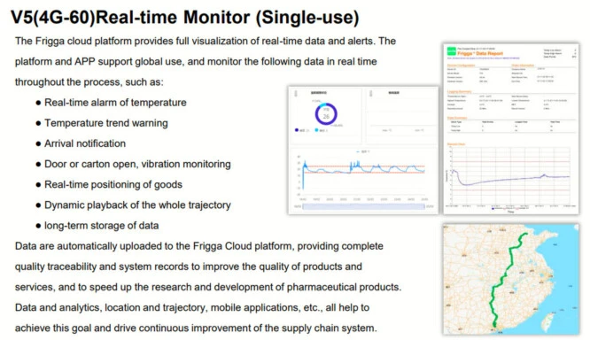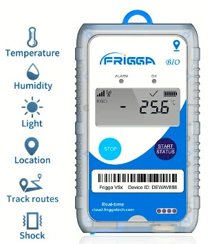 - Frigga V5B(4G-60) is a Single-use real-time temperature and positioning data logger.