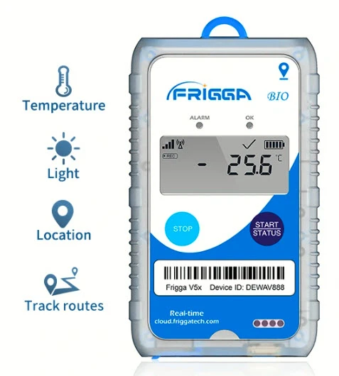 - Frigga V5C(4G-120) is a Single-use real-time temperature and positioning data logger.