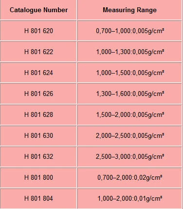 Density hydrometers without thermometer, measuring span 0,150g/cm³ and 0,250g/cm³, scale graduation 0,005g/cm³, measuring range 0,700 upto 2,000g/cm³.