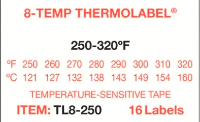 Our water resistant 8-Temp Thermolabel temperature label features temperature sensitive elements that produce a non-reversible white to black color change at the rated temperature.