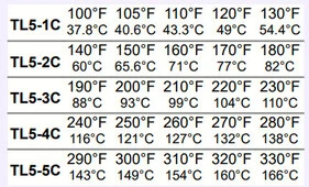 Our 8-Temp Thermolabel Classic products feature eight incremental temperature sensitive elements that produce a nonreversible white to black color change at their rated temperatures.