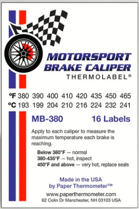 Now Paper Thermometer has a temperature label specifically for the motor sports applications to monitor brake caliper temperatures – the New Motorsport Brake Caliper THERMOLABEL® 380-465°F (Item #: MB-380).