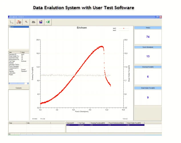 The testing machine is equipped with digital displays for indicating the sheet holder force, the drawing force. as well as the drawing punch stroke.