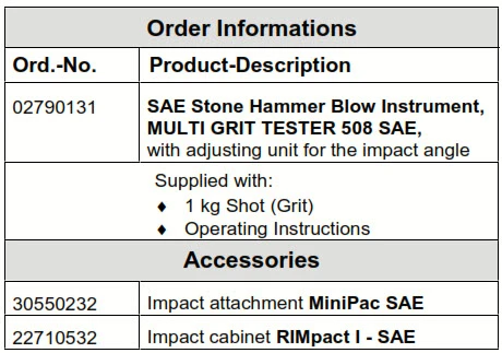 The new MULTI GRIT TESTER 508 SAE is a stone hammer blow testing instrument equipped with an adjustable impact angle, contrary to the execution of VDA.