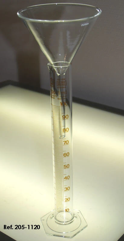 Designation : Salt Spray Cabinet 100 ml rain gauge Funnel (2 units), diameter 100mm, height 180mm, with stem diameter 10mm, height 100 mm, cylinder measuring 100ml:1ml amber grad. glass base
