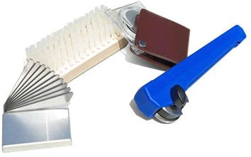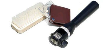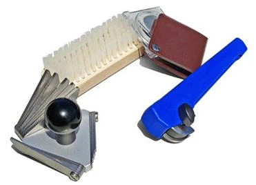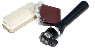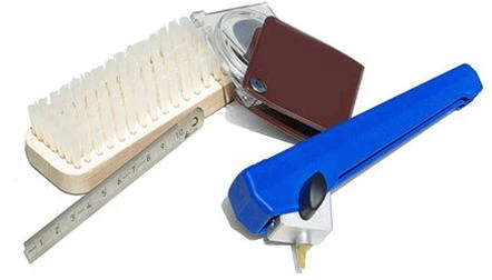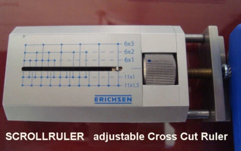 Ergonomical optimized, triangular version with handle and 5 swivel-mounted folding rulers of 1 mm, 2 mm and 3 mm thickness each, for Grid Cutting Tests acc. to EN ISO, ISO, ASTM, JIS, BS, NF, SNV, EN and VDA, incl. magnifying glass, polyamide bristle brush and plastic case