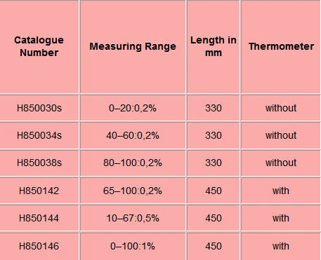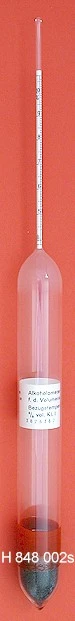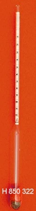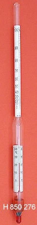 Alcoholometers for destillation receiver, divisions round the scale, without thermometer, or with thermometer 0+35:1°C, with red or blue special filling.