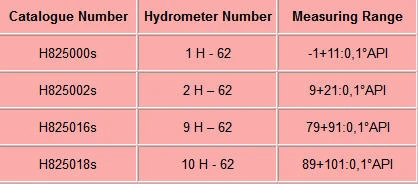 API gravity thermohydrometers, 51H upto 60H, 380mm long, reference temperature 60°F, available in three different thermometer ranges: L, M and H.