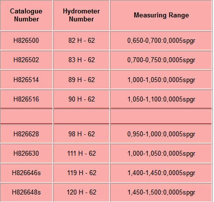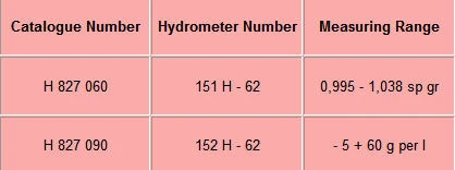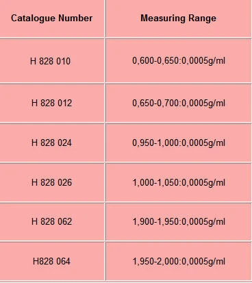 Specific gravity hydrometers, 102H upto 108H and 125H upto 132H, scale graduation 0,001 sp gr, 260mm long, scale graduation 0,001sp gr, measuring range 0,650 upto 1,400, reference temperature 60/60°F