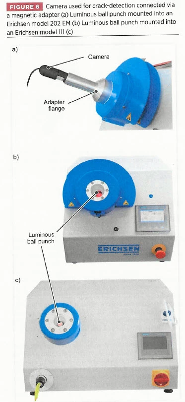 The most critical failure mode in sheet metal forming is the occurrence of a crack or fracture. In order to describe the formability of the material, which is nceded in manufacturing to define specific process windows, the development of the crack during the forming process as well as the strains reached during crack initiation are used. In the Erichsen cupping test according to DIN EN ISO 20482 the crack detection is either performed through visual inspection by the machine operator during the running process or automatically by a crack detection system.