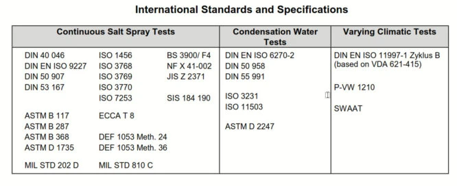 The best known processes employ spray vapour tests using various salt solutions as well as condensation water climates.