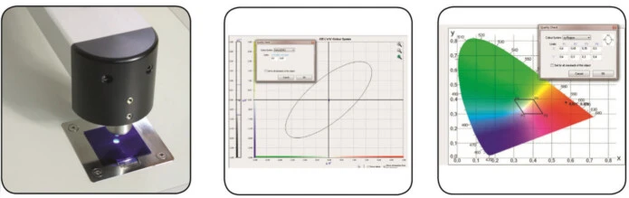 Hereby evaluating with the CIE (Commission internationale de l’éclairage) colour matching functions, colour metric data such as L*, a*, b* can also be measured.