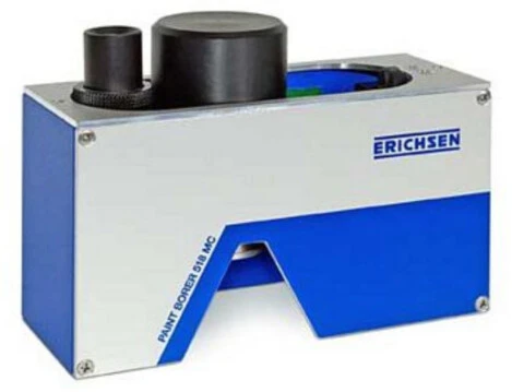 Tabletop instrument for measuring the thickness of organic coatings on all base materials using the wedge cut principle, with microscope to be turned and moved sideways for measurements on ellipsoidal holes on lightly curved surfaces.