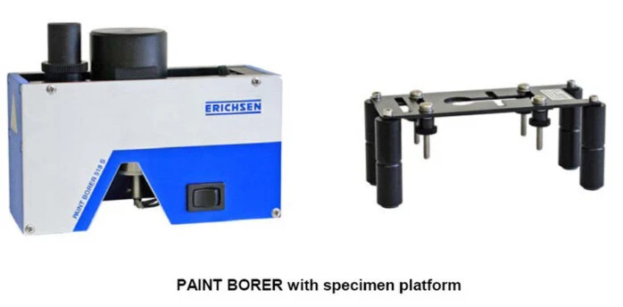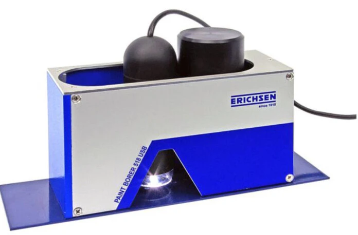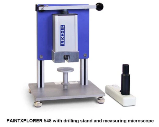 for measuring the thickness of organic coatings on all base materials using the wedge cut principle, with microscope to be turned and moved sideways for measurements on ellipsoidal holes on lightly curved surfaces.
