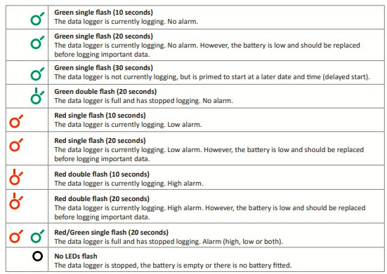 ▪ The first LED flashes red to indicate that the EL-USB-1-LCD is in an alarm condition. It will flash when the logged temperature