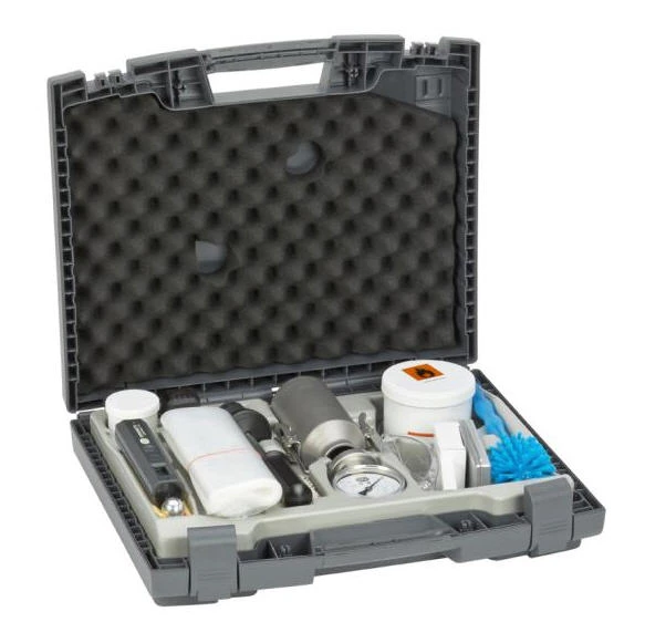 The case set is more extensively equipped however. Amongst other things it contains the Hydromette Compact B moisture indicator to reduce the number of individual CM measurements necessary, to scan larger surfaces quickly and efficiently and to achieve a significantly higher level of test reliability. The preliminary test unit works non-destructively using a high frequency field.