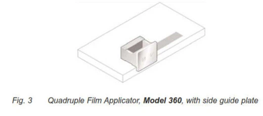 With Model 421 up to 10 parallel film strips of different thickness can be produced in a single application. This film applicator is therefore particularly suitable for investigations into properties that are dependent on film thickness such as