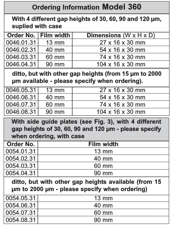 The Models 288 and 360 are doctor blades with fixed gap heights, selectable between 15 and 2000 μm.