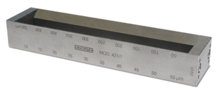 For checking the film applicators maximum deviations of 5 µm/10 %/10 µm are fixed for gap heights in the measuring range below 50 µm/50 - 100 µm/over 100 µm.