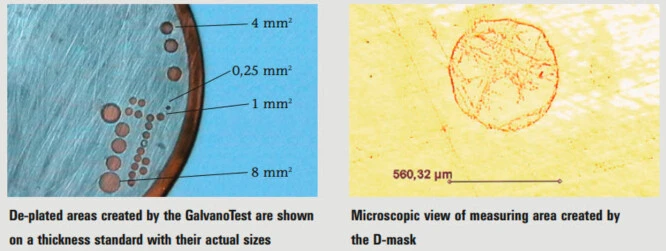 The illustrations below represent the actual deplating area size along with a microscopic view of the measuring area delimited when using the D-mask (0,25 mm2).
