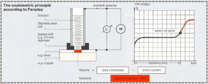 The anodic dissolution method, also known as the coulometric method, functions similarly to the electroplating process: an electrolyte separates individual metal coatings from the substrate with the help of an electric current.