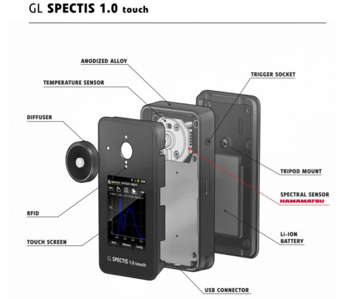 • GL SPECTIS 1.0 Touch - illuminance spectrometer, usb cable, power supply, leash, display protection foil 4 GB micros SD card & case