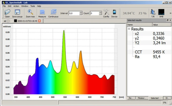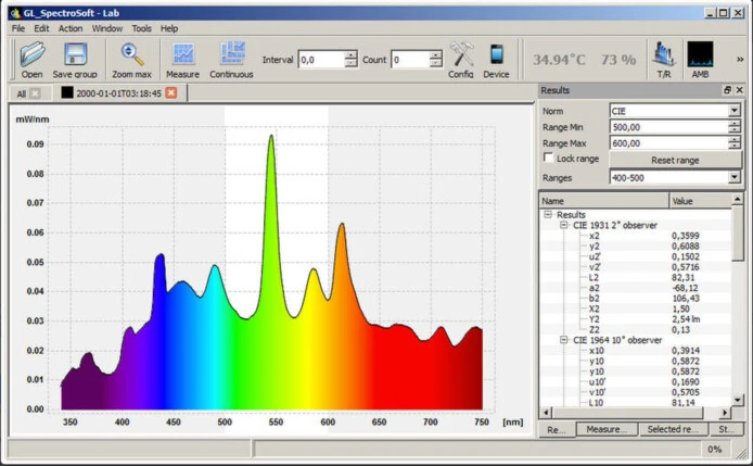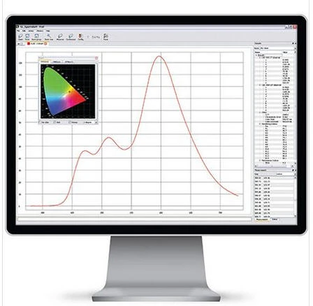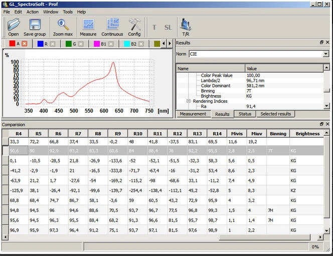 Depending on the purchased license level (Basic, PRO or Lab) GL Spectrosoft can calculate, evaluate, present or report such parameters as: CCT, chromaticity error, peak wavelength, dominant wavelength, CRI, color coordinate values according to CIE standards, ISO, Metamerism Index, PAR, PPF, PPFD, photobiological safety, binning, MacAdam ellipses and much more.