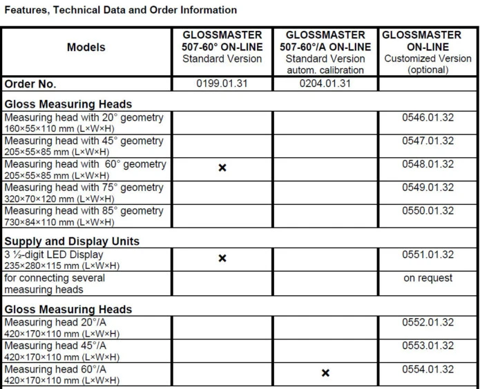 - Online measuring head with 20°, 45°,75, 60° or 85° standard geometry with or without automatic calibration (customer 's choice) ; integrated zero and high-gloss standards for internal calibration, pressure nozzles to prevent contamination (required compressed air connection 4 bar).
