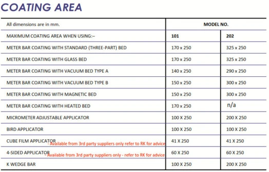 A three-part melinex/foam/rubber coating bed is supplied as standard. Vacuum, magnetic, heated and glass beds are also available.