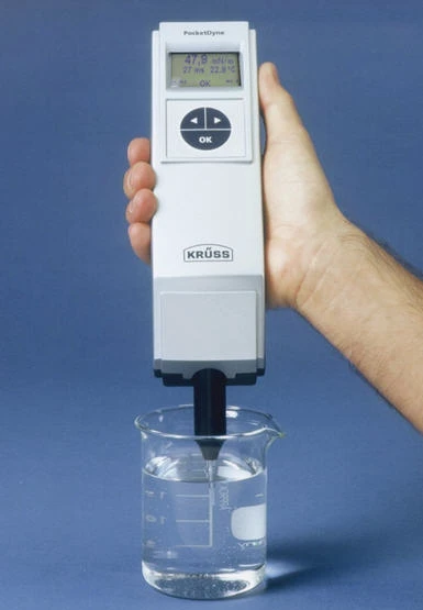 The novel tensiometer PocketDyne is characterized by its high flexibility and mobility in use. You can measure under any conditions possible and virtually in any beaker, container or tank. The ease of use is underlined by its robustness and ergonomic design following the long tradition of KRÜSS in this direction. The PocketDyne can be operated using one hand only. The three large function keys are easily reached by the thumb of your hand.