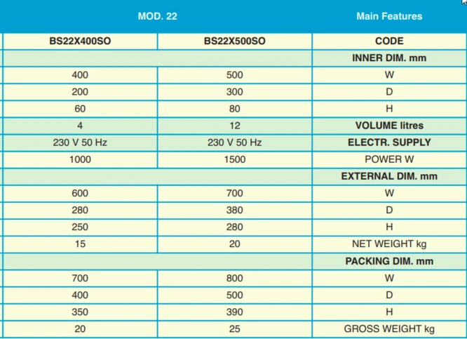 • Steel outer casing stove enameled with epoxy colours• Tank in stainless steel AISI 304 with handle for extraction• Heating by armored heaters elements• Energy regulator Simmerstat type• Range Temperature: From Ambient Temperature +10°C to +350°C approx.