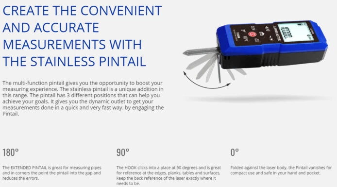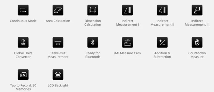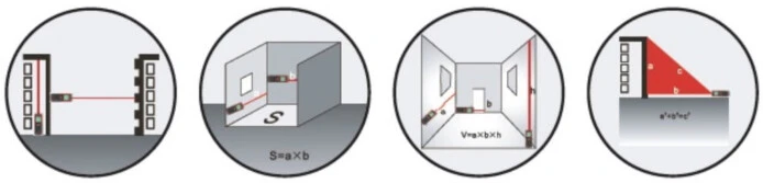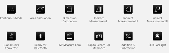1. Area Measurement ( Area mode to measure width and length)2. Volume Measurement3. Indirectly Height I, II & III Measurement (base on Pythagorean)4. Indirectly Height IV, V & VI Measurement (base on Angle Sensor)5. Stake-Out Measurement6. Continuous mode (you can quickly find the diagonal of a room (maximum value) and the horizontal distance (minimum value) by continuously moving the distance meter until you get what you need.)