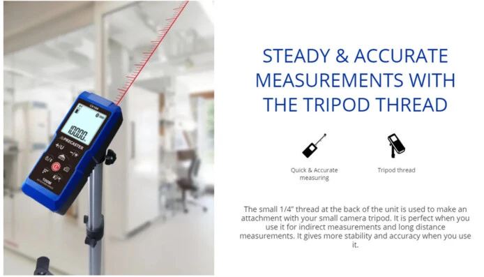 - Versatile laser distance meter that instantly measures up to 100 meters with one-button point-and-click operation
