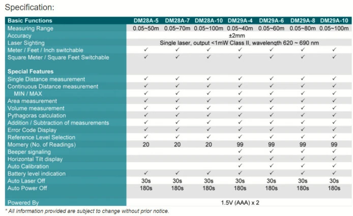 - Able to store the twenty (DM28A) / ninety nine (DM29A) measurements for quick recall