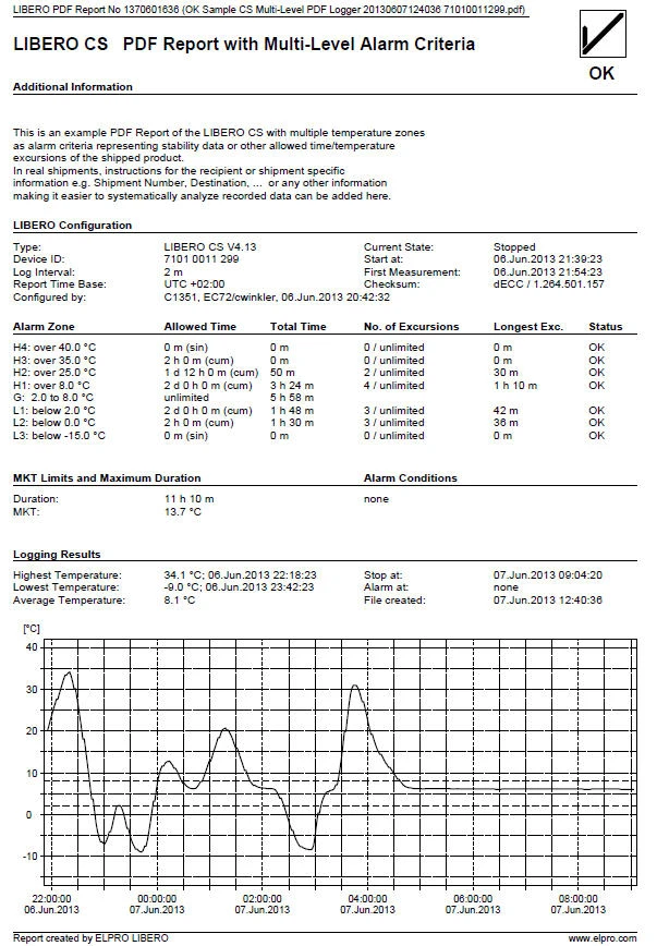 two alarm thresholds and alarm delayApplication area Cold Chain Monitoring – applications monitored with strict alarm limits, MKT or time