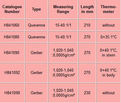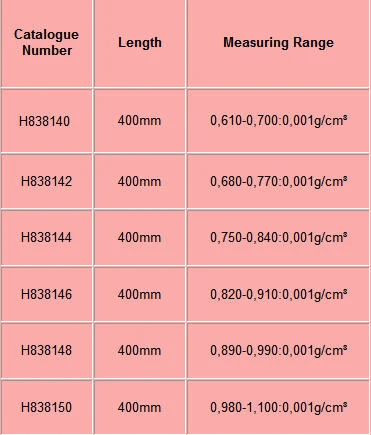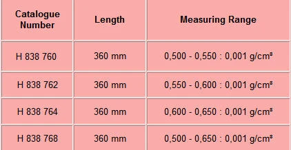 DIN 18 123, 0,995 upto 1,030 in 0,0005 g/cm³, 350mm long, reference temperature 20°C.