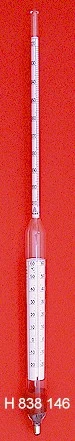 Hydrometers for liquified petroleum gas, DIN 12 804, measuring range from 0,500 upto 0,650, in 0,0005g/cm³, reference temperature 15°C, with thermometer 0+30:0,5°C, thermometer bulb with glass jacket protection, 405mm long.