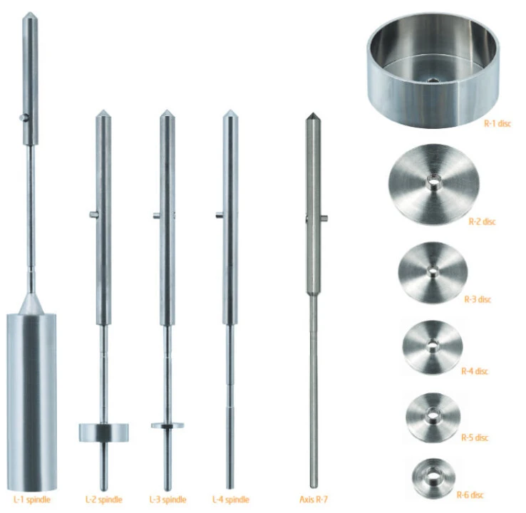 Stainless steel discs measuring system for viscosity measurements in a 150 mL beaker.
