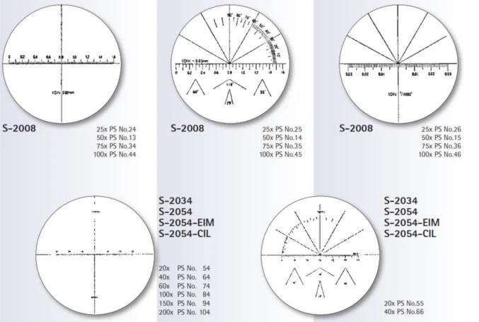 Lenses offering from 2x to 30x magnification are available for the standard microscope. The measurement scales associated with each magnification (lens) can be changed in the eyepiece. To ensure a rapid, dependable and clean use when frequently changing scales we recommend changing the entire eyepiece.