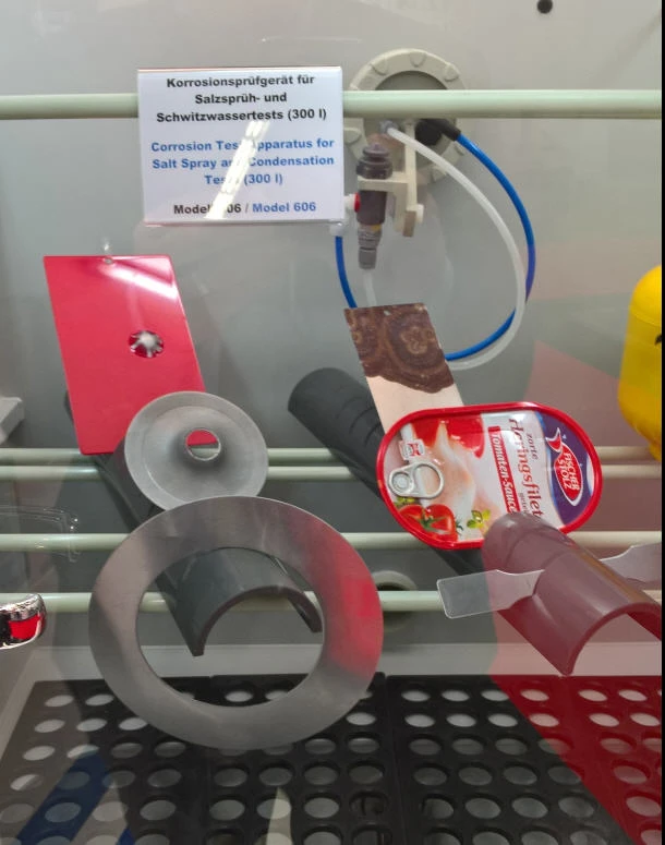 It consists of a test chamber of 300 l capacity, and a built-in control unit as well as an integrated storage tank for approx. 125 l salt solution.